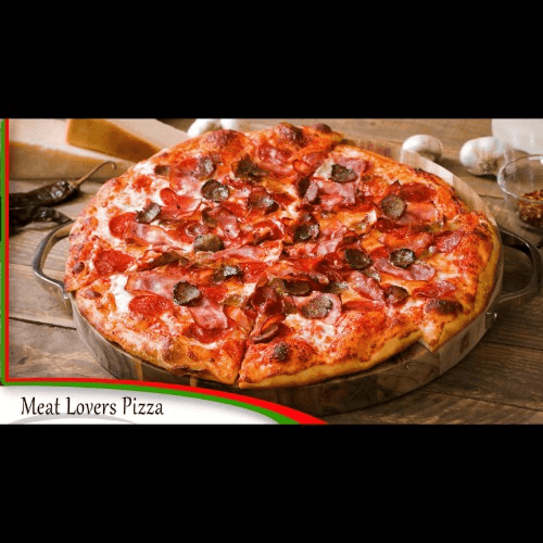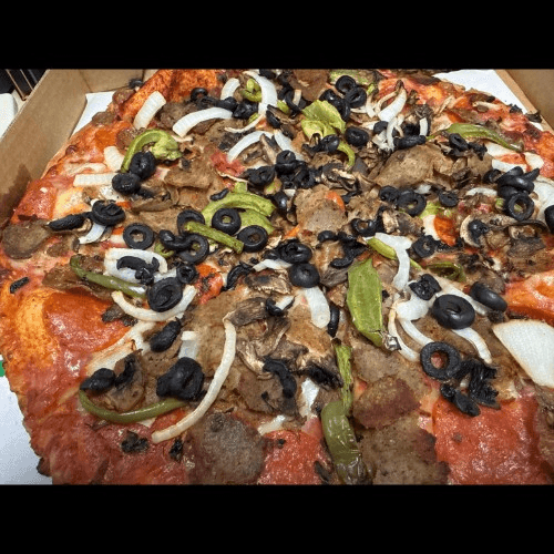 Pepperoni, sausage, meatballs, mushrooms, onions, green peppers & black olives
